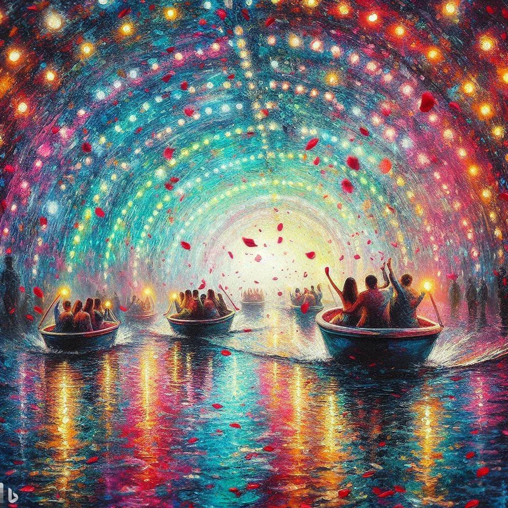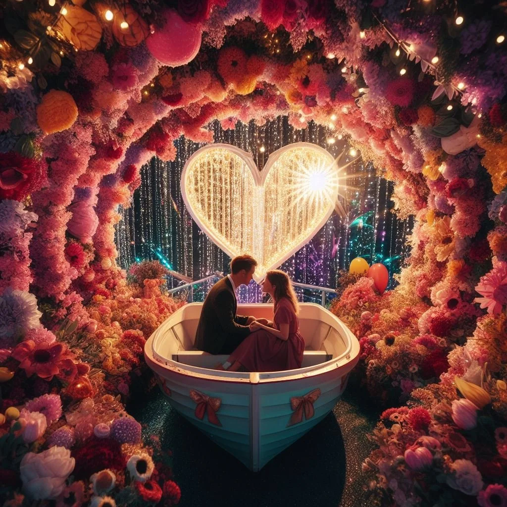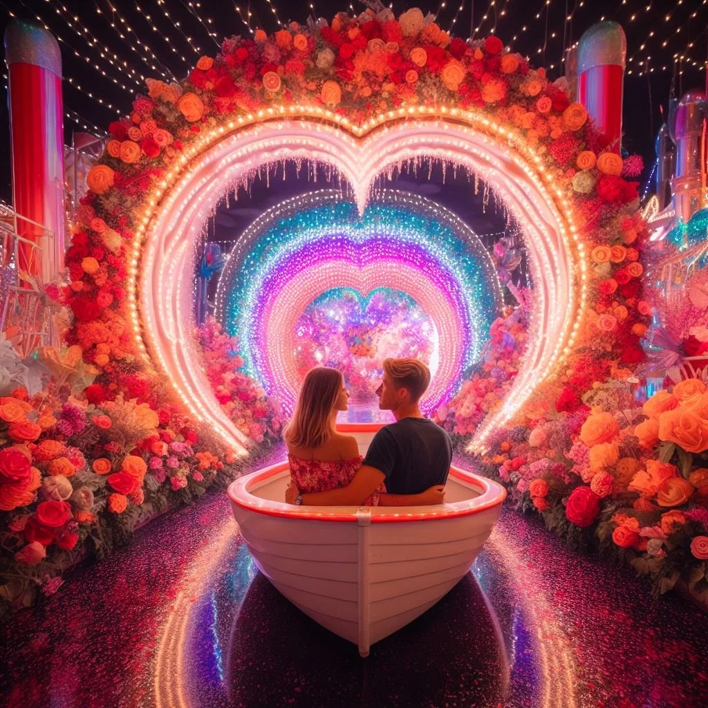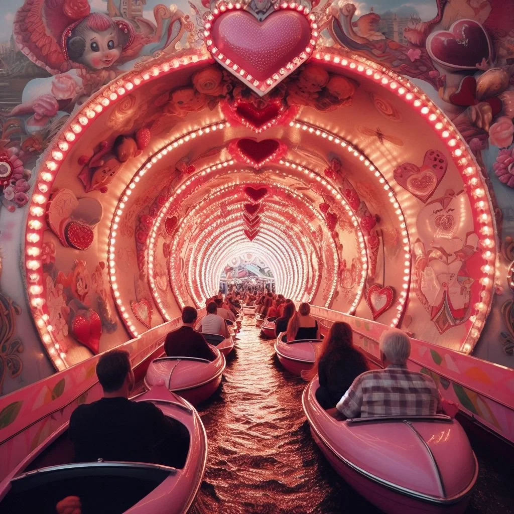 exerpt of a daily news article in the 1950s on the topic of the modern tunnel of love vs the old scary original version “Research has shown that the snarls, howls, and groans of the hideous sights along the way, while palpably phony, will cause the female to precipitate herself into the male's arms,”The Daily News humorously explained, leftover halloween props were often more romantic than pink-and-red decor. the 1950 article reads. “Her fright is usually as phony as the hazards of the course, but it serves a useful purpose”. When two characters are about to get together on a television show, they may find themselves at an amusement park. There they stumble upon the Tunnel of Love—a boat ride that forces passengers to share a snug seat as they float through a dimly-lit enclosure. What follows has become a pop culture cliché: The would-be couple blushes as they squeeze into a swan-shaped vessel built for two. As they drift past cardboard cupids and neon hearts, their hands inch closer to each other’s in the dark. When they emerge from the tunnel several minutes later, the pair looks much more comfortable than when they entered.